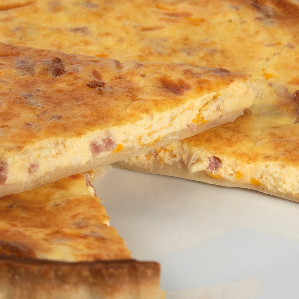 Combina una base suave y dorada con un relleno cremoso de quesos y bacon, cocinada al punto para lograr una textura delicada y un sabor equilibrado.
